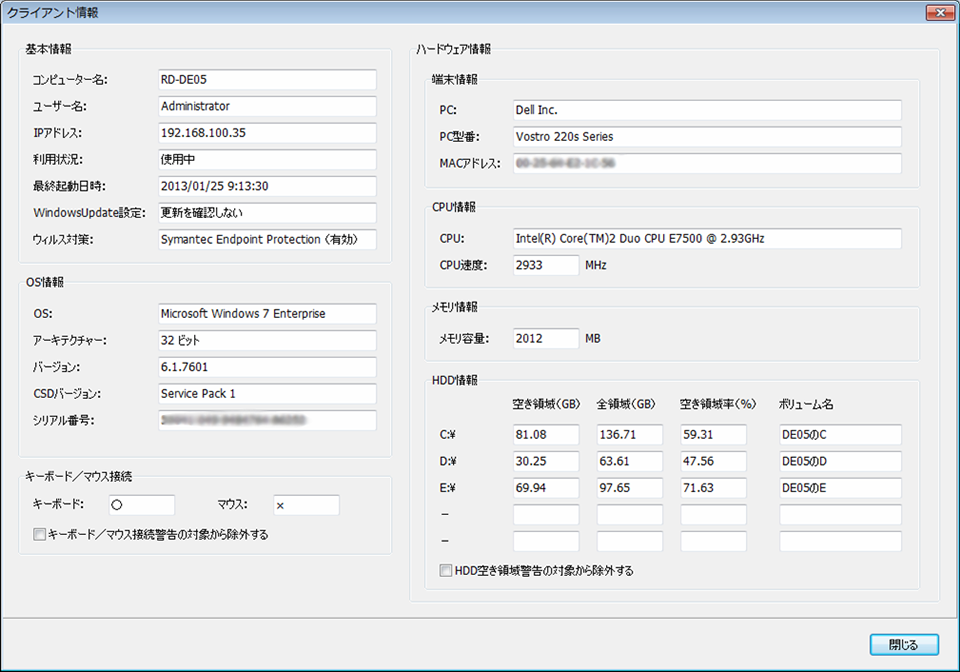 最大250台までのクライアントPCを登録し、PCのスペック(HDD・メモリ容量・CPUタイプ・速度・Windows Update 設定状況など)の情報を把握し管理することができます。