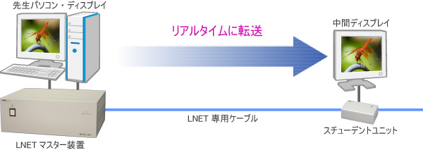 画像の転送はハードウェア転送方式ですので、先生のパソコンのマウスカーソルの動きや、ブルーレイやDVDなどの画面などの動画も遅延なくリアルタイムに転送できます。