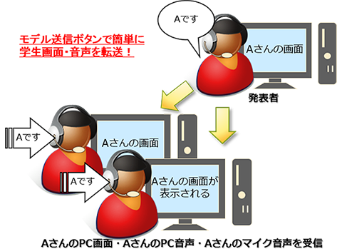 画像のみの転送タイプと画像・音声転送タイプの2タイプをご用意していますので、ニーズに合わせて選択して頂けます。音声転送機能を搭載するタイプでは、語学講義等に利用することが可能です。(音声付きスチューデントユニットの場合)