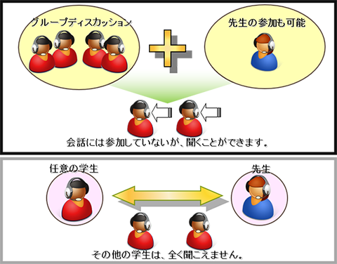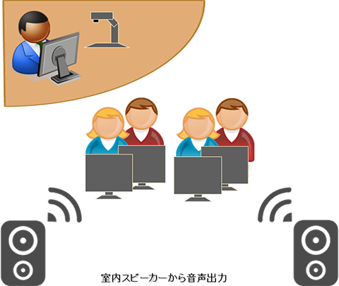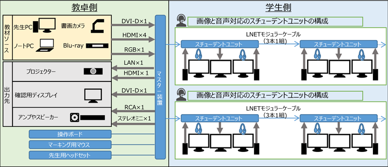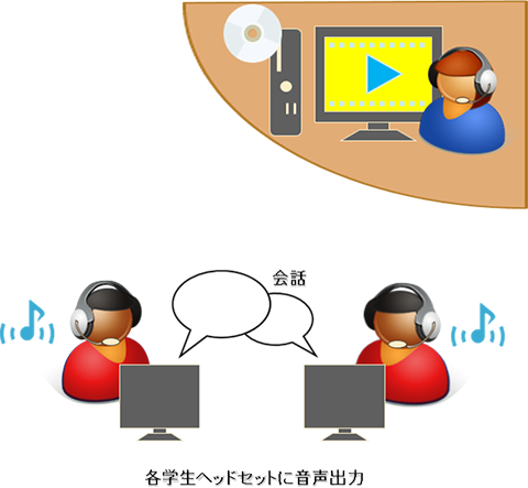 語学講義等を行いたい(音声教材転送や会話)、学生が作成した音声付き作品や資料を発表させたい、ヘッドセットをつけることで講義以外の音を遮断して集中しやすい環境をつくりたいなどあれば、音声の送受信機能も備える機器構成がおすすめです。