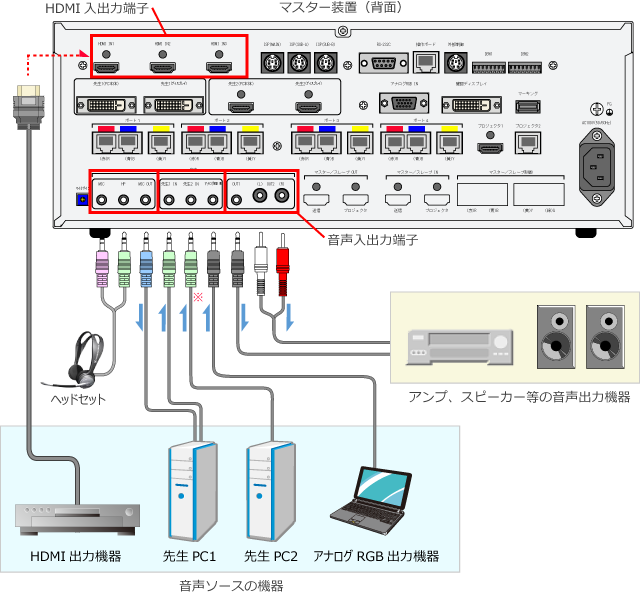 • HDMI端子のない先生パソコンを2台接続する場合は、2台目をHDMI-DVI変換プラグで先生PC2のHDMI端子に接続してください。その場合に先生PC2のパソコン音声を『LNET-870』を経由して音声を出力したい時は、パソコンの音声出力をマスター装置の音声入力端子の先生2に接続してください。