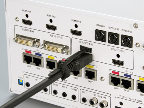 1系統のデジタルDVI-D入力端子(DVI-D24ピン)を標準装備していますので、HDMI出力端子のないパソコンでもDVI-D端子で先生パソコンを1台接続できます。