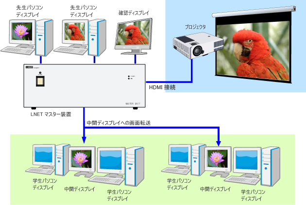 先生パソコンの画面やブルーレイ/DVDや書画装置などの教材画像を、中間ディスプレイ(教材提示用ディスプレイ)に一斉送信します。
