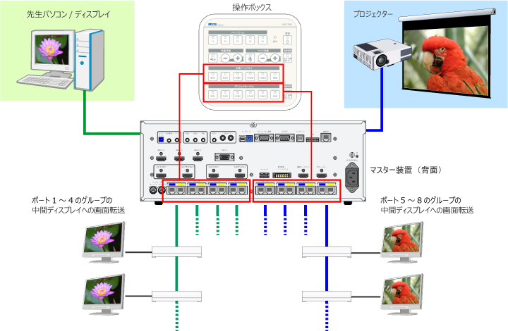 接続ポート1~4のグループには、操作ボックスの「中間ディスプレイ」のボタンで送信ソースを選択します。接続ポート5~8のグループには、操作ボックスの「プロジェクター(PJ)」のボタンで送信ソースを選択します。
