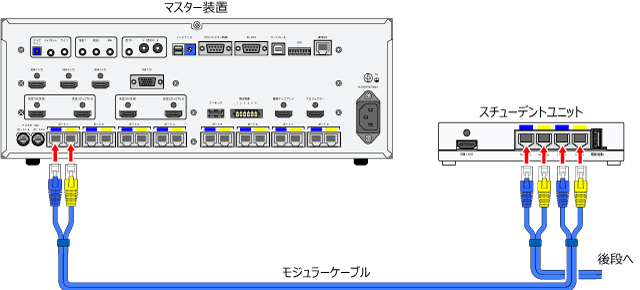 マスター装置(親機)~スチューデントユニット(子機)間、スチューデントユニット(子機)どうしの間は、2本1組のLNET専用のモジュラーケーブルで接続します。