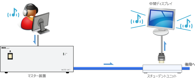 スピーカー内蔵タイプのディスプレイを中間ディスプレイに用いると、ソース選択した画像と音声が中間ディスプレイに送信されます。音声は、中間ディスプレイのスピーカーから出力されます。