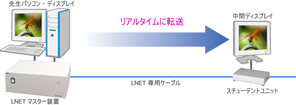 デジタル片方向画像音声転送システム『LNET-930』は、パソコンや映像機器のデジタルコンテンツの送信に対応し、アナログRGB端子も搭載してレガシーコンテンツも活用できるようにした授業支援システムです。