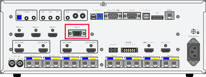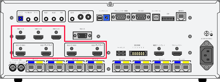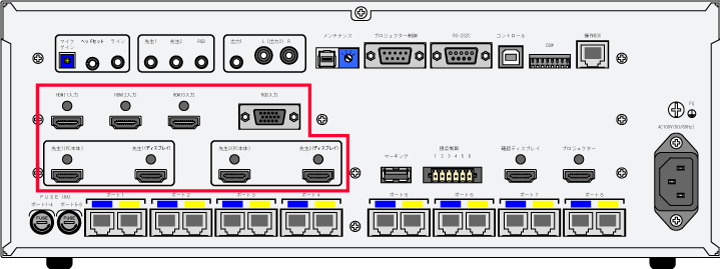 デジタルHDMI × 4(教師用PCの折り返し出力 × 2・確認用ディスプレイ出力 × 1・ プロジェクター用出力 × 1)